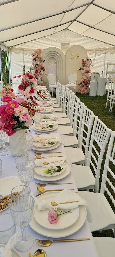 Tafels & Stoelen: Comfortabel en stijlvol, passend bij elk soort evenement. Denk aan ronde of langwerpige tafels.
